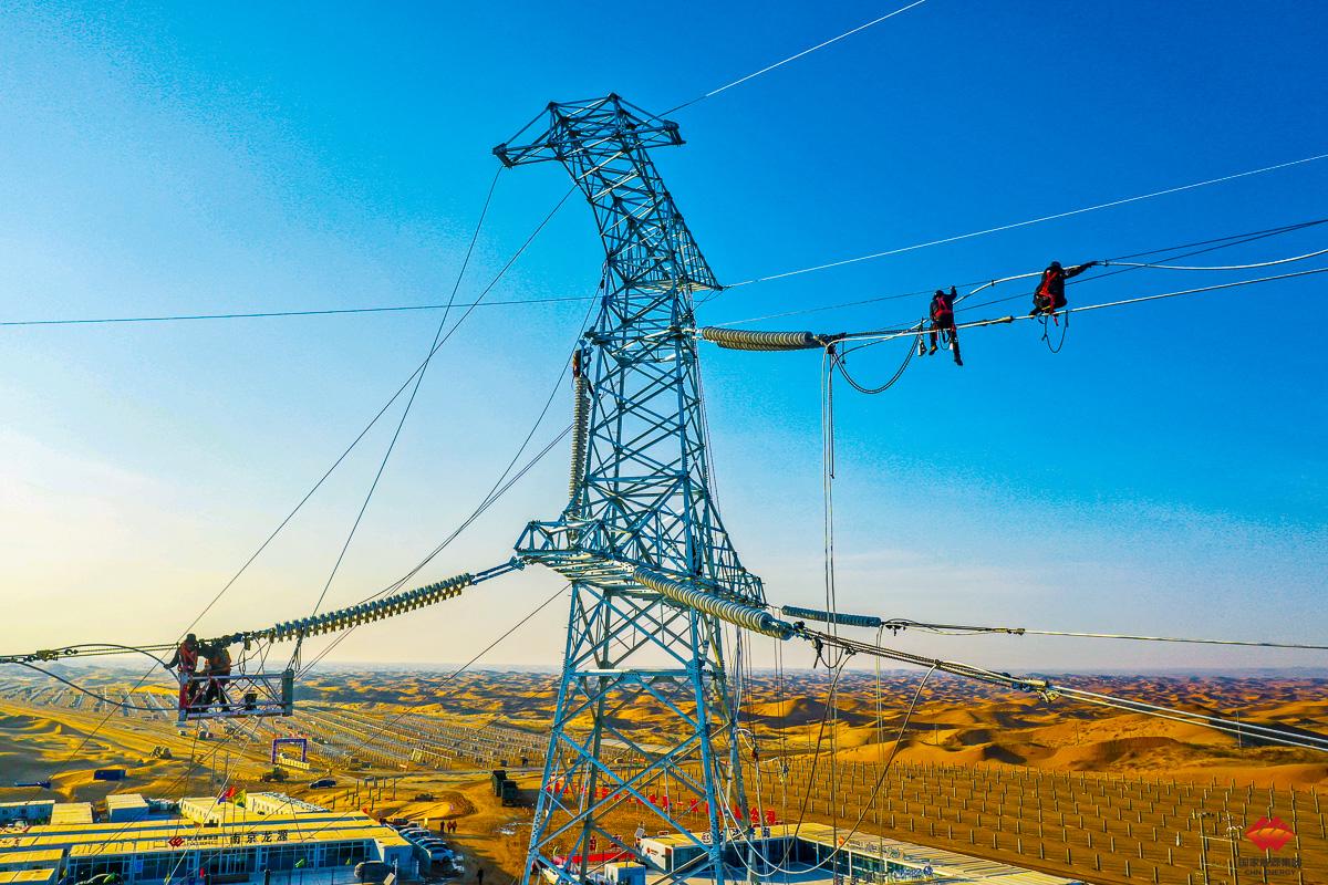 2022年12月15日,龙源电力宁夏腾格里“沙戈荒”新能源基地中卫一期100万千瓦光伏项目正在开展送出线路架线工作。基地配套建设4座升压站、3座储能电站、7台调相机,精准平抑新能源发电波动,确保绿电“送得出、用得稳”。刘天齐 摄