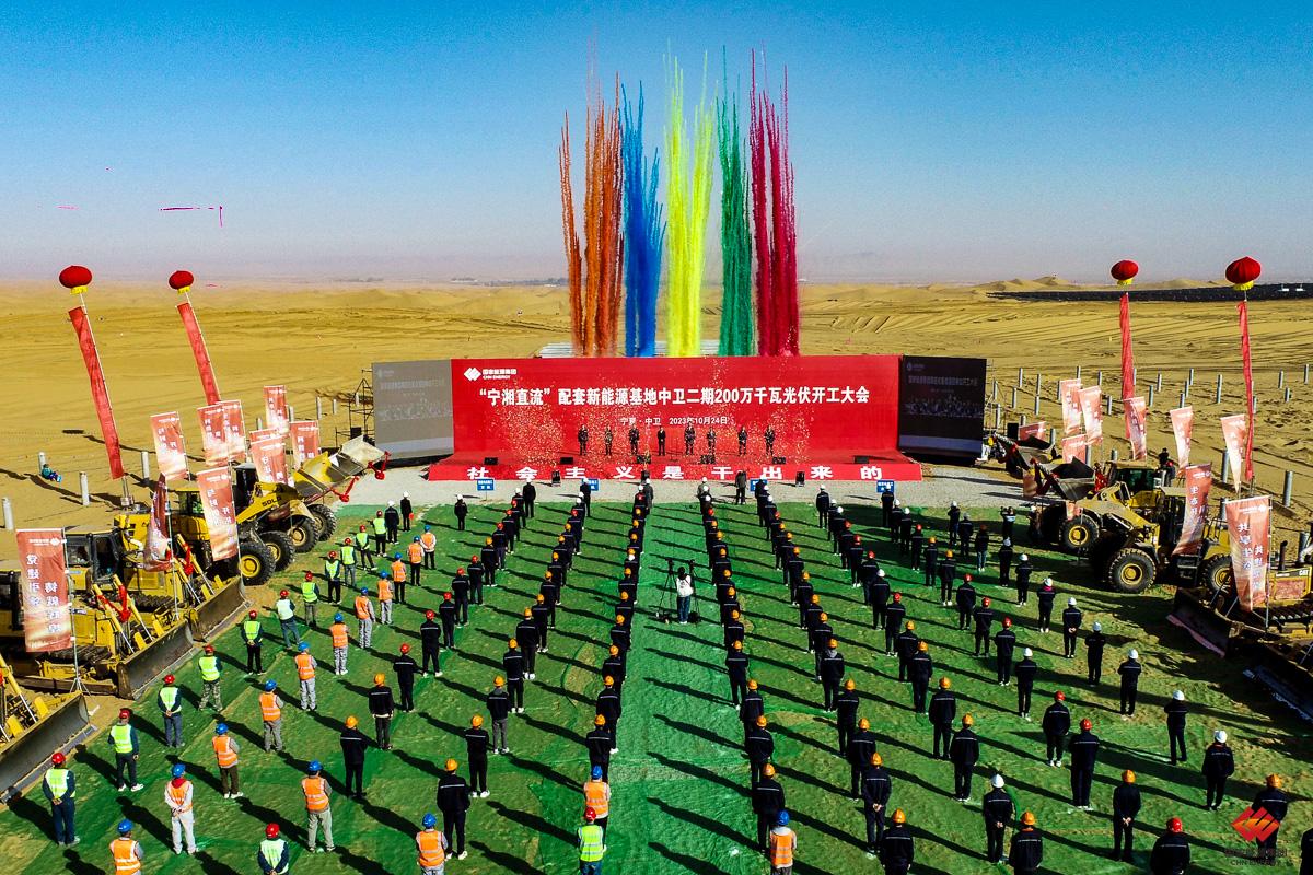 2023年10月24日,龙源电力宁夏腾格里沙漠“沙戈荒”新能源基地二期200万千瓦光伏项目开工仪式。二期项目占地面积约6万亩,全部采用平单轴光伏支架设计,总容量200万千瓦,预计年均发电量39.46亿千瓦时。张乾斌 摄